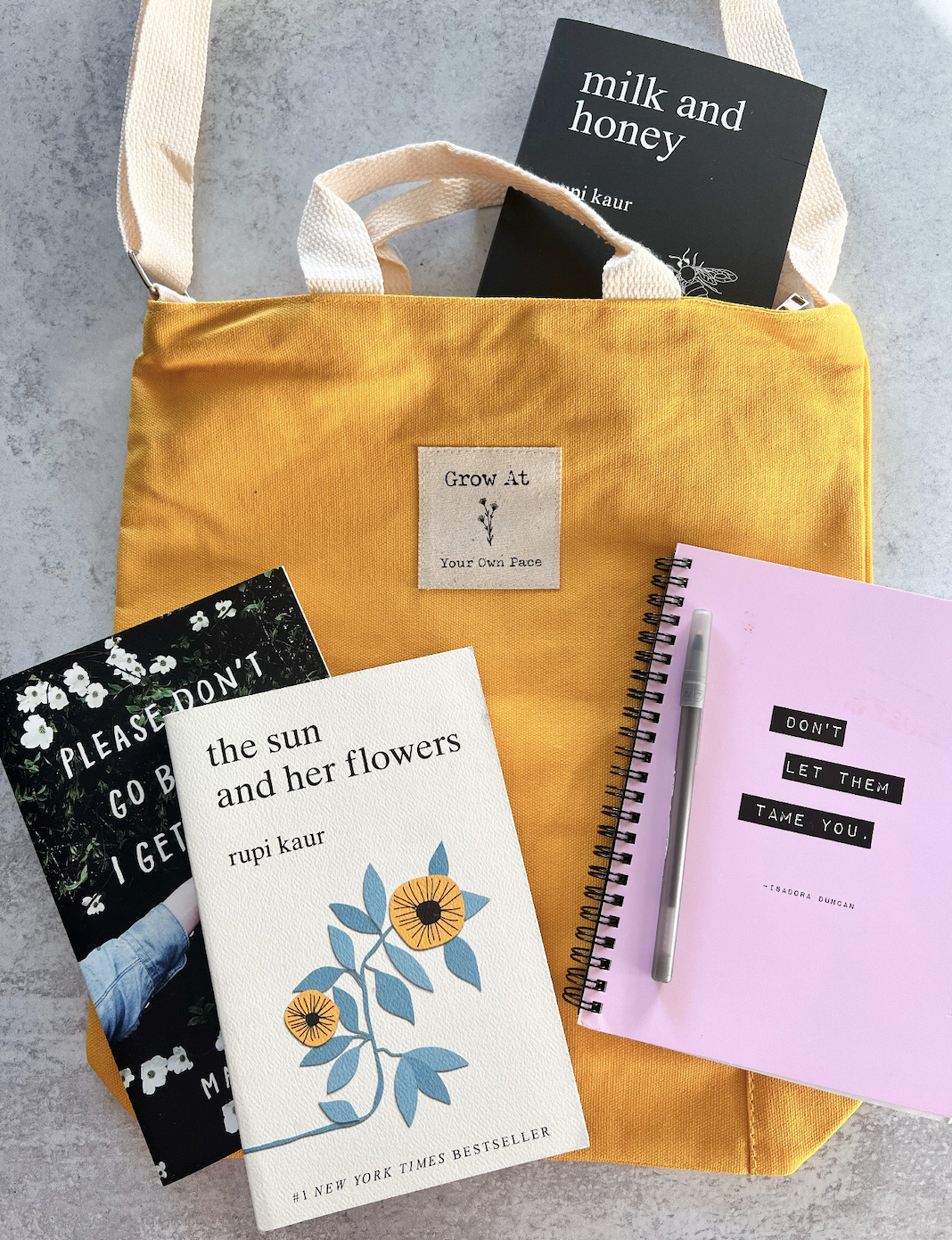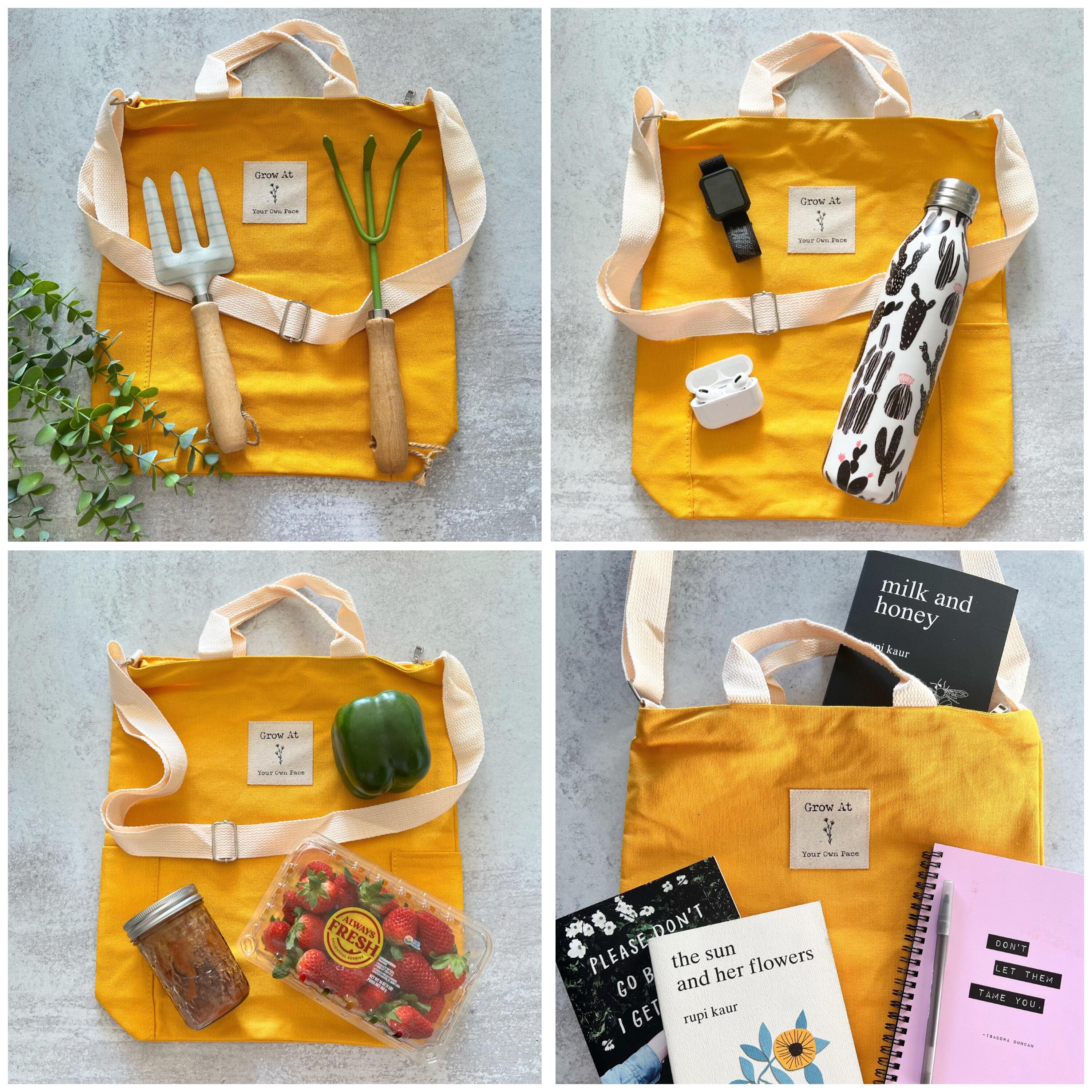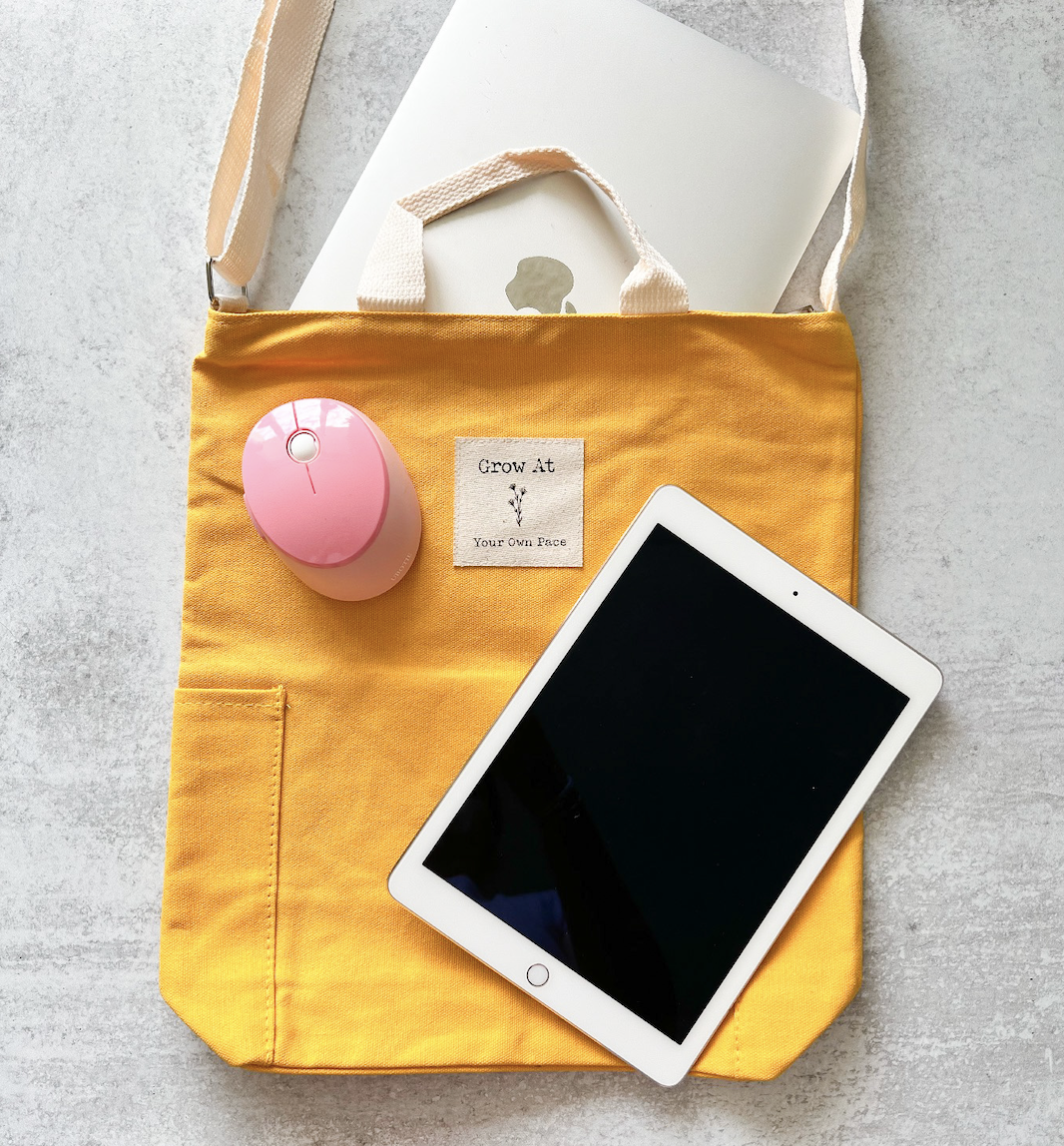 "Such a nice bag. I’m currently in med school and a cute tote that comfortably holds all of my textbooks is a rarity. Plus, it can literally fit the whole chickens I pick up from my local market. I’ve gotten a ton of compliments on it from my friends and I really love the “Grow at your own pace” saying on it, reminds me not to compare myself to others. Love it." - Annie